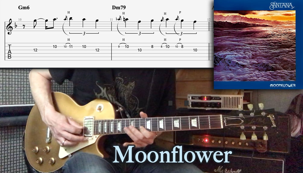 Sheet music, tablature and backing track to play "Moonflower" by Carlos Santana.